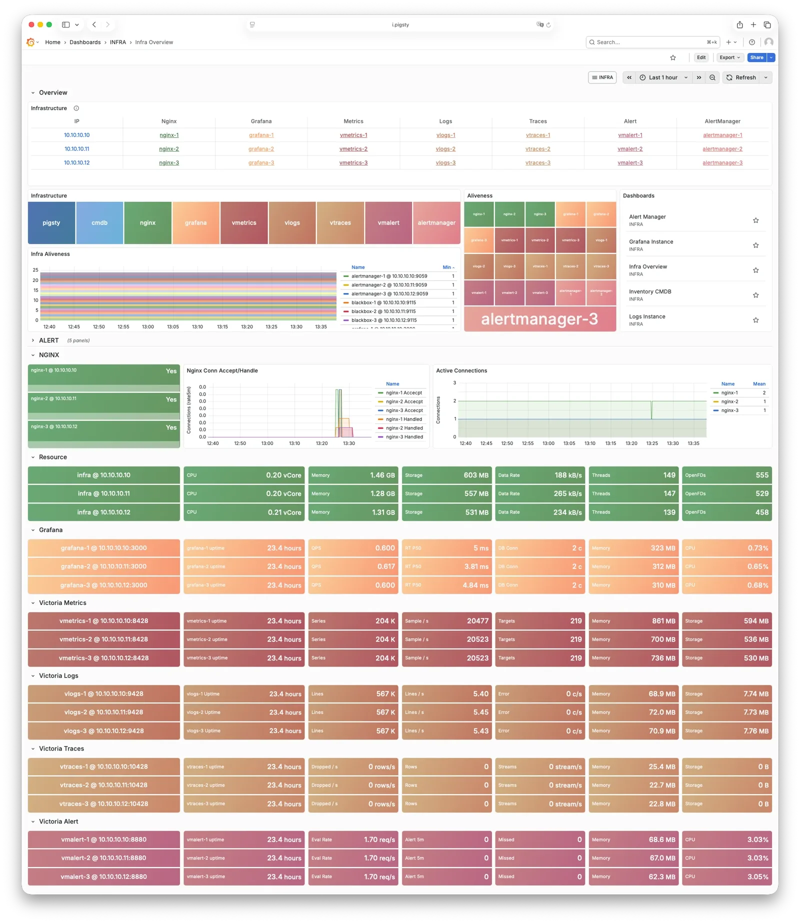 Pigsty 提供了基于开源的 Grafana / Prometheus 现代可观测性技术栈做 监控 的最佳实践:,Grafana 负责可视化呈现,VictoriaMetrics 用于收集监控指标,VictoriaLogs 用于日志收集与查询,Alertmanager 用于告警通知。Blackbox Exporter 负责检查服务可用性。整套系统同样被设计为一键拉起,开箱即用的 INFRA 模块。