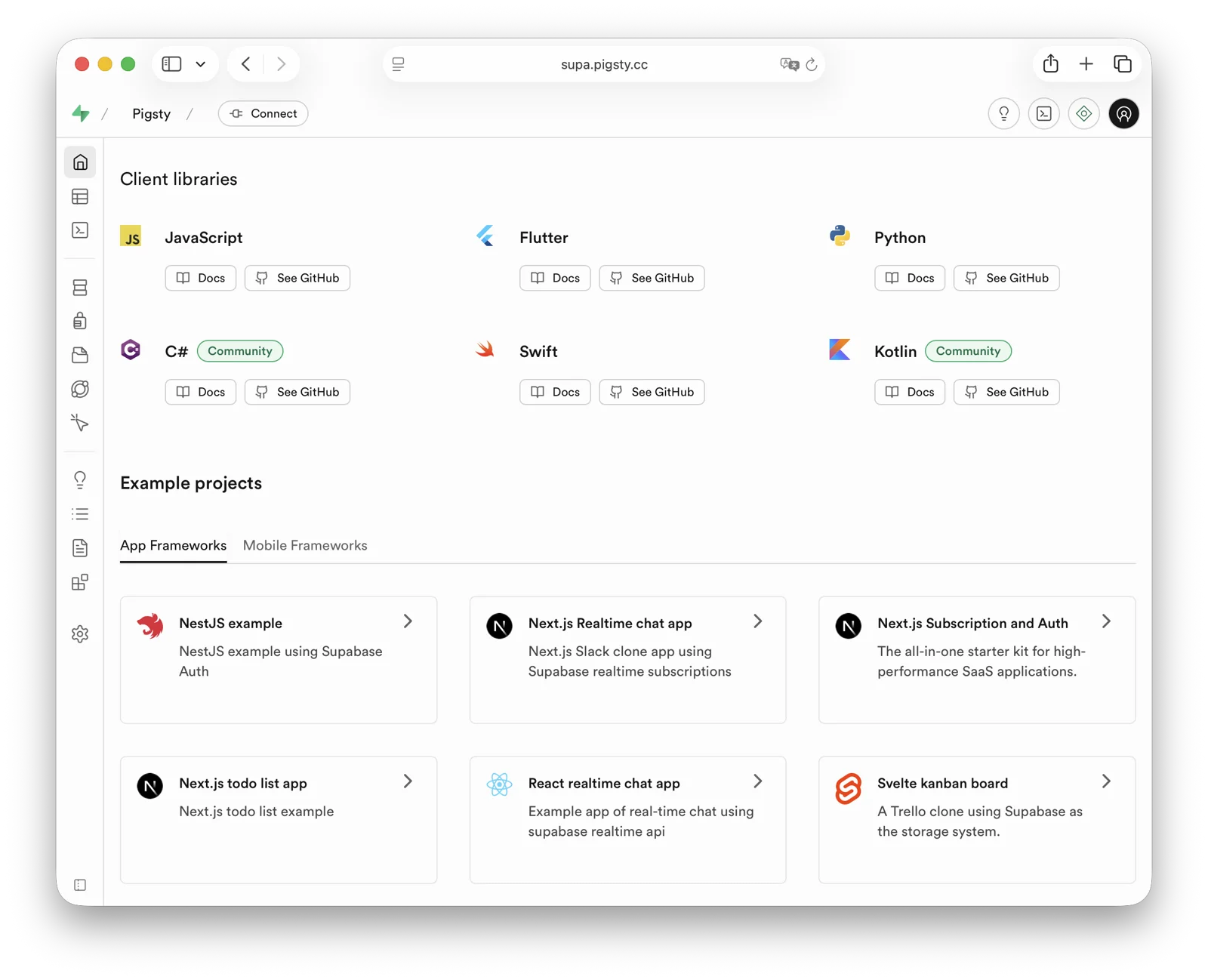 Pigsty 也提供了与 PostgreSQL 紧密联系的应用开发工具集:PGAdmin4、PGWeb、ByteBase、PostgREST、Kong、以及 EdgeDB、FerretDB、Supabase 这些使用 PostgreSQL 作为存储的"上层数据库"。