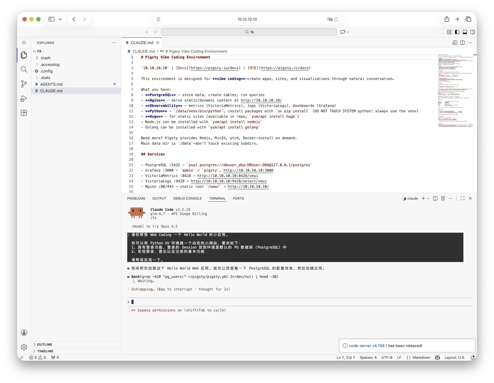 接下来,你就可以动嘴开始 Vibe Coding 了,默认情况下 /fs 是存放在 PostgreSQL 里的共享目录,也是 VSCode,Jupyter 的默认家目录。 家目录里放置了 CLAUDE.md/AGENTS.md 环境说明,建议在这个目录里面 Vibe Coding。